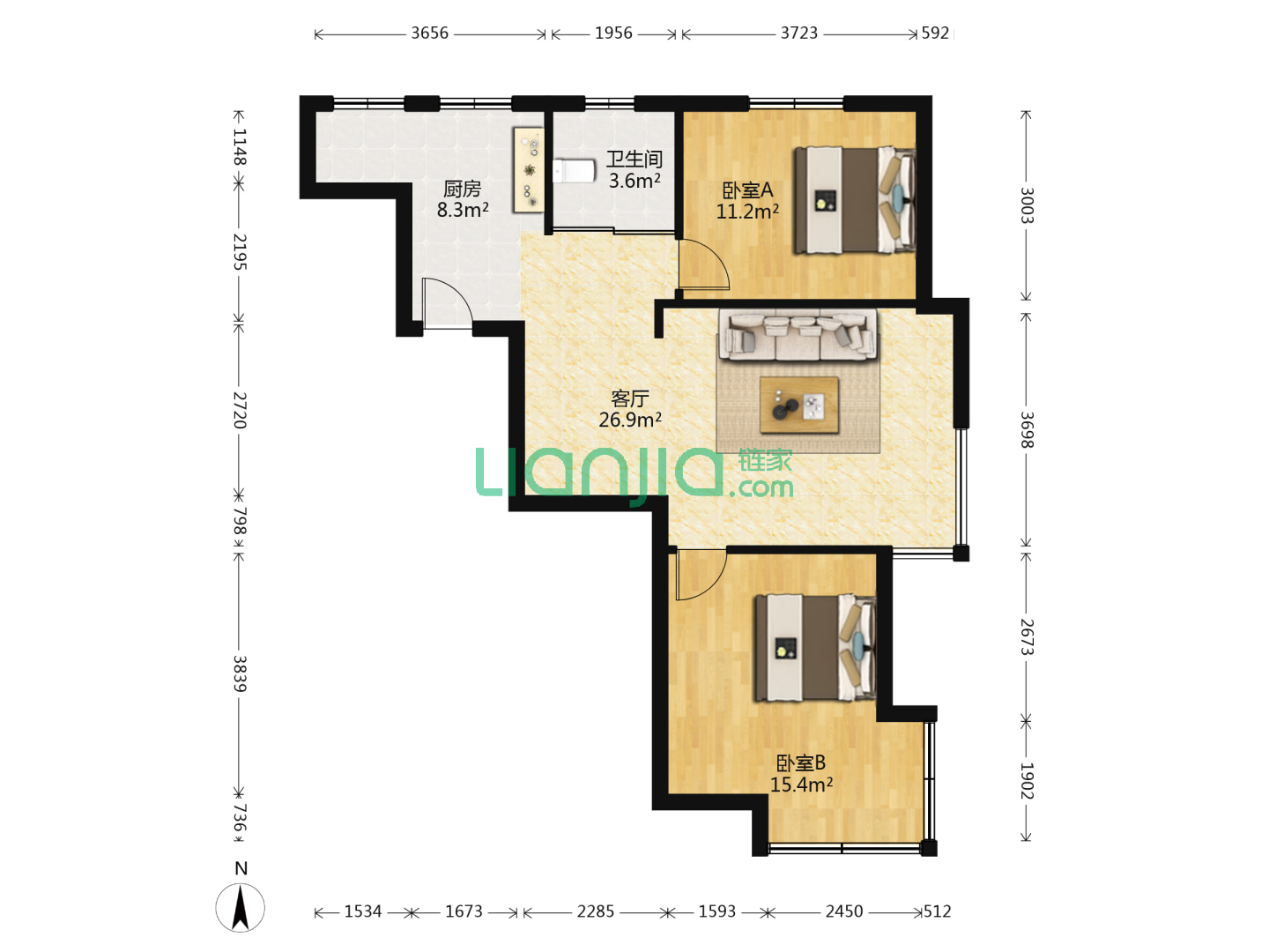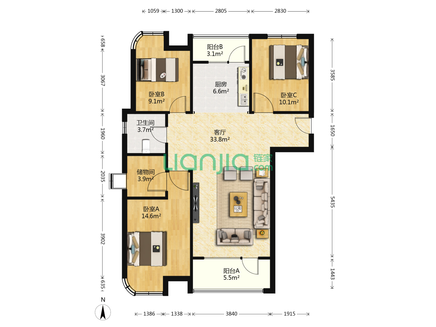 2室1厅1卫 103㎡